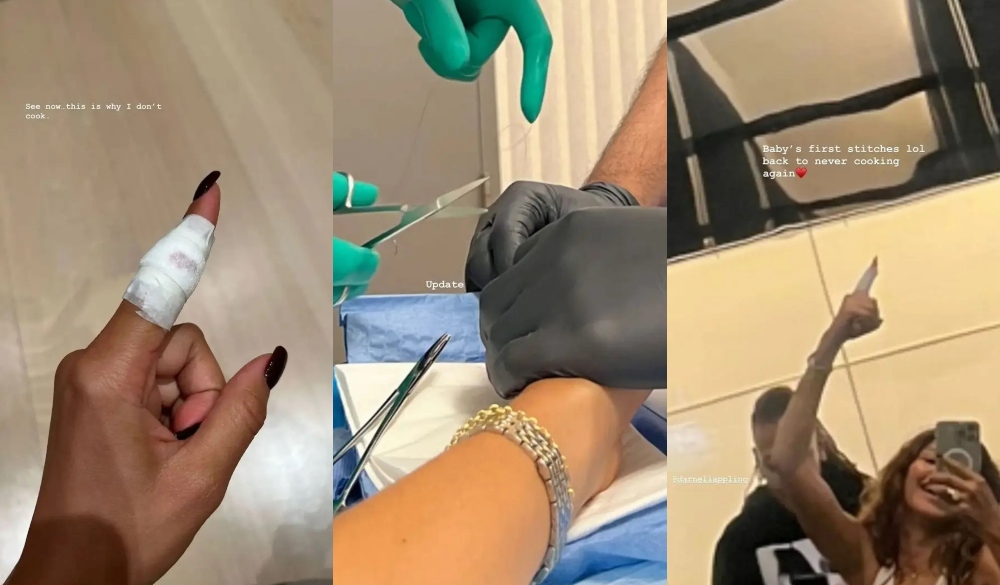 Δεν ξέρουμε ακριβώς πώς κατέληξε σε αυτό, αλλά στο Instagram δημοσίευσε μία φωτογραφία του χεριού της, όπου ο δείκτης της ήταν τυλιγμένος με γάζα και έγραφε, “Βλέπετε τώρα… γι’ αυτό δεν μαγειρεύω”. Λίγο αργότερα, μάς έκανε update από το νοσοκομείο, όπου βλέπουμε δύο γιατρούς να την φροντίζουν και να της κάνουν ράμματα, ενώ λίγο πιο μετά έβγαλε selfie σε καθρέφτη, δείχνοντάς μας περήφανα το μπανταρισμένο της δάχτυλο και ανακοινώνοντάς μας ότι δεν θα ξαναμαγειρέψει. “Τα πρώτα ράμματα του μωρού. Lol. Πίσω στο να μην μαγειρέψω ποτέ ξανά”.