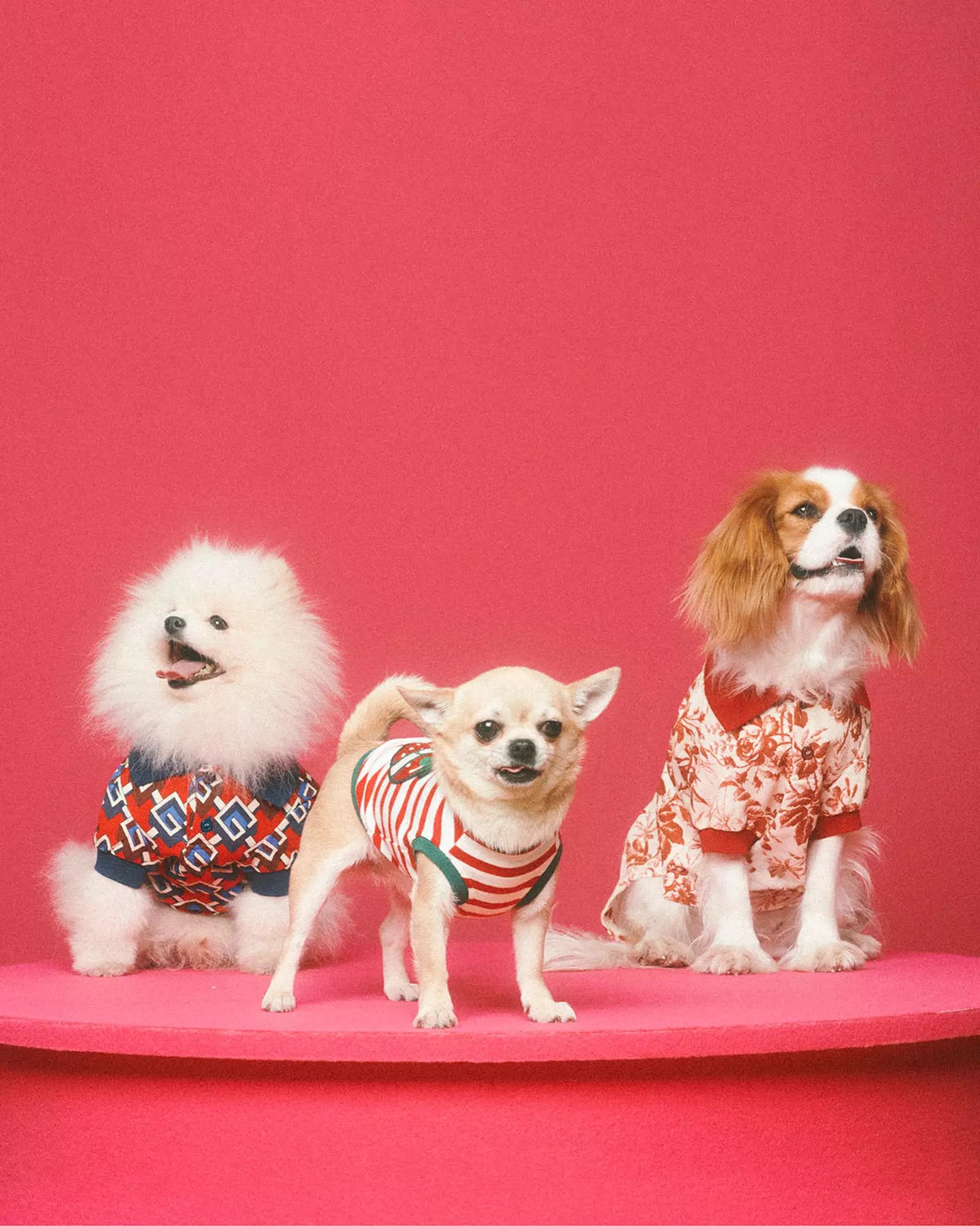 Για τα κατοικίδια που ταξιδεύουν τακτικά υπάρχουν οι ανάλογες τσάντες μεταφοράς στον χαρακτηριστικό καμβά GG. Στα ενδύματα τώρα, υπάρχουν μπλουζάκια πόλο, T-shirts, πλεκτά και παλτουδάκια σε μια μεγάλη ποικιλία με χαριτωμένα σχέδια όπως φράουλες και καρδιές που συνυπάρχουν με το χαρακτηριστικό μοτίβο του μονογράμματος G της εταιρίας.