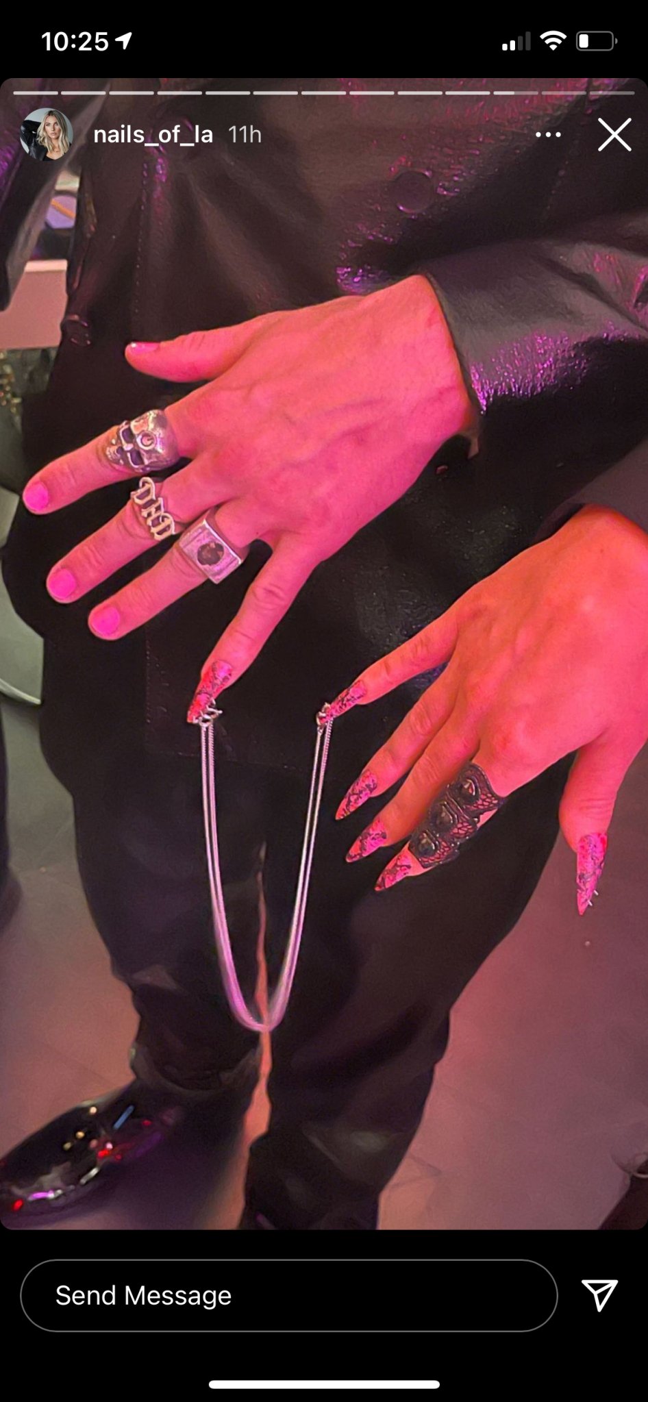Σύμφωνα με την nail artist που είναι υπεύθυνη για το λουκ, χρησιμοποίησε τρεις διαφορετικές αποχρώσεις από την κολεξιόν του MGK, συγκεκριμένα τις “Party Favor,” “25 to Life,” και “Depressionist.”