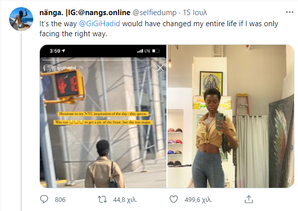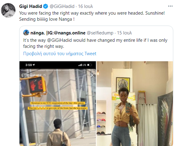 Έπειτα από αυτό το post η Gigi δεν έχασε χρόνο και έκανε άλλο ένα διαδικτυακό shoutout στο μοντέλο αυτή την φορά απαντώντας της στο Twitter, “Κοιτούσες ακριβώς προς την σωστή κατεύθυνση. (Είσαι μια) ηλιαχτίδα! Στέλνω όλη μου την αγάπη Nanga!”.