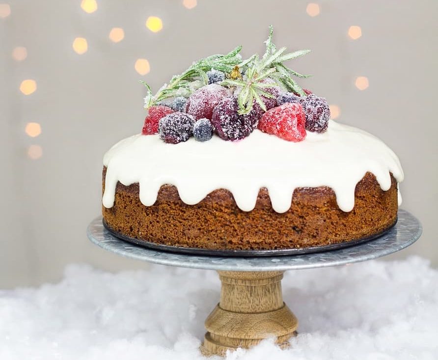 Η βασιλόπιτα της Εύης με γλάσο από γιαούρτι και φρούτα στην κορυφή  που μοιάζει σαν χριστουγεννιάτικο πίνακα.