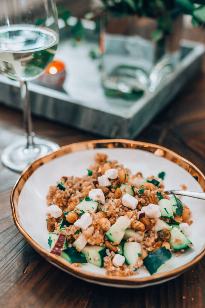 Σε ένα μεγάλο μπολ, ανακατεύουμε το αγγούρι, τα ρεβίθια, τα φιστίκια, το κρεμμύδι, τον μαϊντανό, τον δυόσμο, την φέτα και το πλιγούρι. Ανακατεύουμε για να αναμειχθούν τα υλικά. Αν θέλουμε να δώσουμε έξτρα γεύση, μπορούμε να προσθέσουμε λίγο λεμόνι, ενώ φυσικά μπορούμε να βάλουμε και λάδι, αν δεν μας νοιάζουν τόσο οι θερμίδες. Παρόλα αυτά, η βασική συνταγή είναι από μόνη της πεντανόστιμη και χωράει αρκετές παραλλαγές για όσους αισθάνονται δημιουργικοί. Το κρεμμύδι μπορεί να αντικατασταθεί με φρέσκα κρεμμυδάκια, τα ρεβίθια με φασόλια κάθε είδους, η φέτα με κατσικίσιο τυρί και τα φιστίκια με όποιον άλλον ξηρό καρπό αγαπάμε.