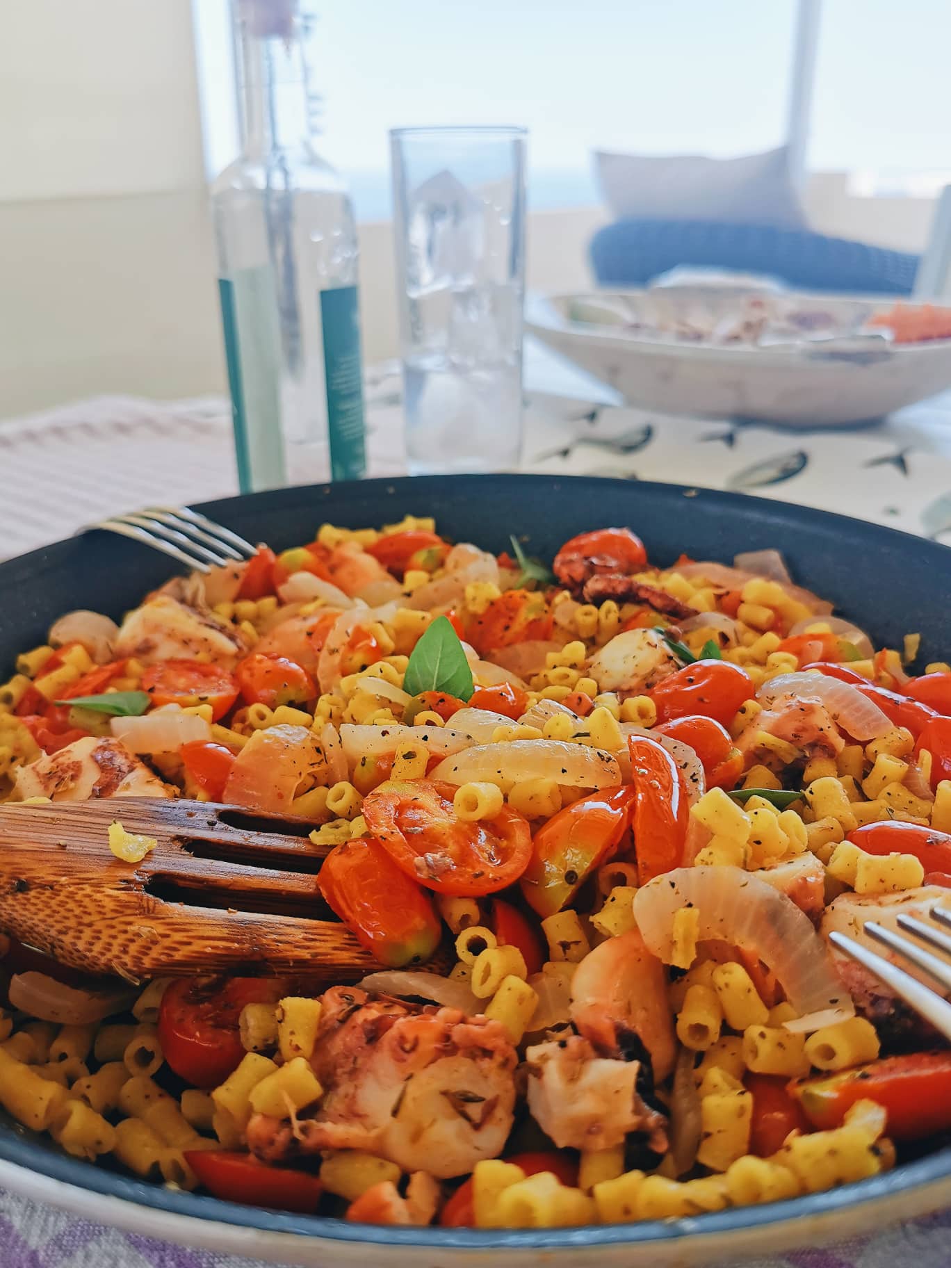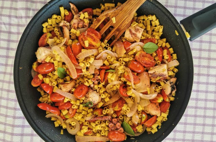 Κόβουμε τα ντοματίνια στην μέση ή αν είναι μεγάλα, στα τέσσερα. Σε ένα βαθύ τηγάνι ζεσταίνουμε το ελαιόλαδο και ρίχνουμε μέσα τα ντοματίνια για να μαραθούν. Στραγγίζουμε το κρεμμύδι και το προσθέτουμε κι αυτό στο τηγάνι. Προσθέτουμε αλάτι, λίγο πιπέρι και ρίγανη. Ανακατεύουμε με μια ξύλινη σπάτουλα και προσθέτουμε 1 φλυτζάνι βραστό νερό. Ρίχνουμε μέσα τα ζυμαρικά και ανακατεύουμε με την σπάτουλά μας. Αφήνουμε το μείγμα να βράσει για 3 με 4 λεπτά και προσθέτουμε λίγο ακόμα καυτό νερό, αν χρειαστεί ώσπου να μαλακώσουν αλλά να μην παραβράσουν. Στο τέλος προσθέτουμε το χταπόδι κομμένο σε μπουκιές και την κάπαρη.