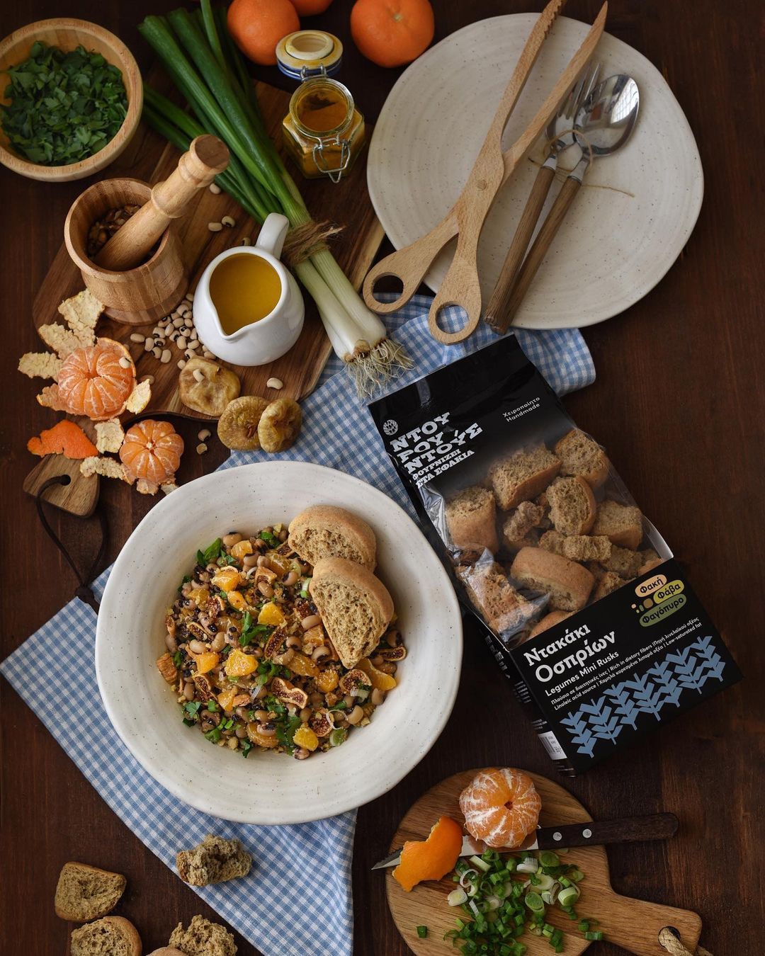 Σαλάτα με φασόλια μαυρομάτικα, μανταρίνι & σύκο συνοδευόμενη με τα απίθανα Ντακάκια Οσπρίων