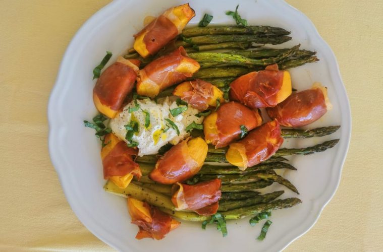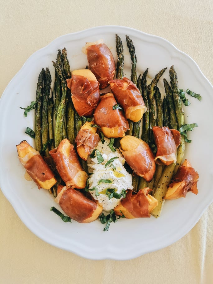 Τα ροδάκινα τα αγαπάμε, το έχουμε δηλώσει και με άλλες συνταγές μας και προσπαθούμε τακτικά να βρίσκουμε νέους τρόπους για να τα απολαύσουμε. Σε αυτό εδώ το πιάτο που σας προτείνουμε, τα τυλίξαμε με prosciutto και τα ψήσαμε στον φούρνο παρέα με ένα μάτσο σπαράγγια. Ύστερα τα παντρέψαμε όλα μαζί με craem cheese και βασιλικό και τα σερβίραμε ως ορεκτικό σε τραπέζι με φίλους που δεν σταμάτησαν να κάνουν ωωωω και μμμμ ώσπου άδειασε η πιατέλα μας.