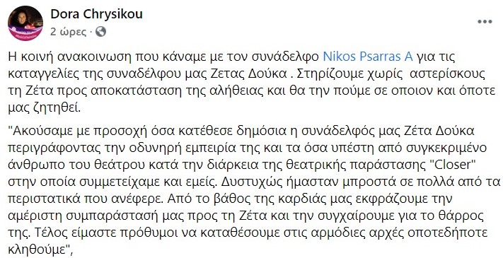Νομίζω ότι χρωστάμε στη Ζέτα Δούκα ένα ευχαριστώ. Η Σοφία Μπεκατώρου άνοιξε τον δρόμο, ώστε πολλοί να βρουν το θάρρος να μιλήσουν για την σεξουαλική παρενόχληση ή κακοποίησή τους. Η Ζέτα Δούκα άνοιξε τον δρόμο, ώστε να αναγνωρίσουμε ανοιχτά και δημόσια (γιατί κλειστά και ιδιωτικά προφανώς το γνωρίζαμε) την ύπαρξη λεκτικής και ψυχολογικής βίας στον χώρο εργασίας. Τον όποιο χώρο εργασίας, μιας και το θέατρο δεν έχει την αποκλειστικότητα.