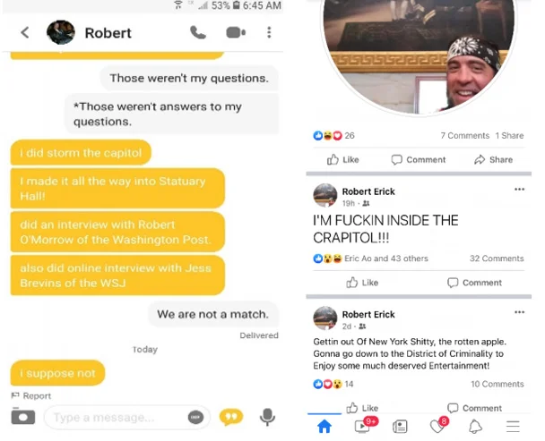 Ωστόσο, μία εβδομάδα αργότερα ο Chapman μπήκε στο dating app Bumble, αναζητώντας την αγάπη και προσπαθώντας να βγει ραντεβού. Εκεί είδε μία γυναίκα που του άρεσε, οπότε προσπάθησε να την πείσει να βγει μαζί του. Ακολούθησε, λοιπόν, την τακτική, που ακολουθούν κι άλλα πολλά μάτσο αρσενικά, και άρχισε να κοκορεύεται για τα κατορθώματά του. Ποιο κατόρθωμά του επέλεξε να αναφέρει; Φυσικά, την επιδρομή στο Καπιτώλιο και τις συνεντεύξεις που έδωσε (ανώνυμα) μετά από αυτήν. “Εισέβαλα στο Καπιτώλιο. Έφτασα μέχρι την Αίθουσα των Αγαλμάτων. Έδωσα συνέντευξη στον Robert O’Morrow της Washington Post και μία διαδικτυακή στον Jess Brevins της WSJ”.
