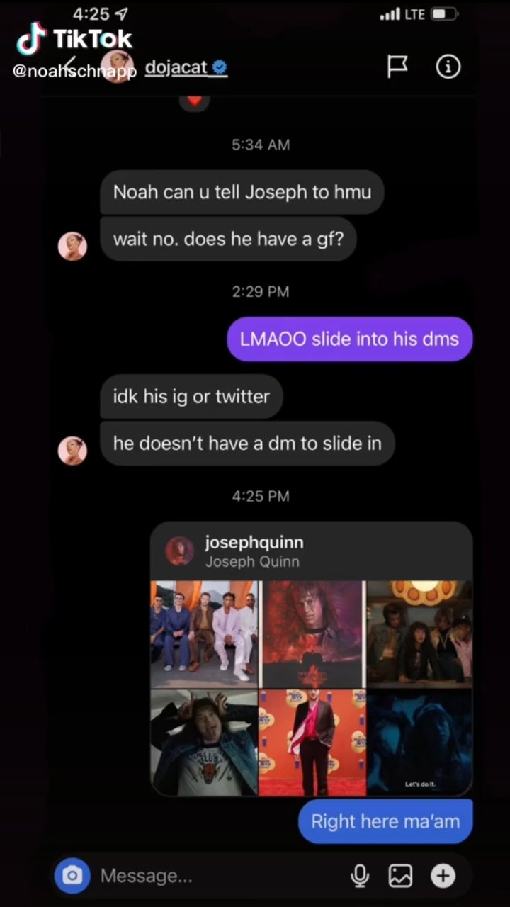 Την Πέμπτη, ο συμπρωταγωνιστής του Quinn, Noah Schnapp, ανέβασε ένα βίντεο στο TikTok, για να μοιραστεί με τους ακολούθους του μία ιδιωτική συζήτηση, που είχε με τον Doja Cat. Αυτή φαίνεται ότι τού είχε στείλει, για να τον ρωτήσει αν ο Quinn έχει σχέση, αλλά και για να τού ζητήσει να τού πει να της στείλει μήνυμα. Μάλιστα, όταν εκείνος της είπε ότι μπορεί απλά να τού στείλει DM, τού εξήγησε ότι δεν μπορεί να βρει τα social media του. Ο Schnapp, λοιπόν, της έστειλε το Instagram του και γρήγορα την είδαμε να ξεκινά να τον ακολουθεί.