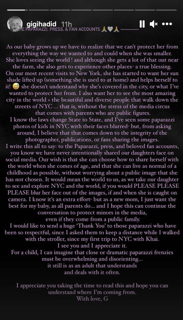Αυτό φαίνεται ότι στεναχώρησε και ανησύχησε, παρά νευρίασε, την Hadid. Γι’ αυτό δημοσίευσε ένα γράμμα προς τους παπαράτσι, τον Τύπο και τα fan accounts, με το οποίο εξήγησε τη θέση της και ζήτησε από εδώ και πέρα να κρύβουν το πρόσωπο της κόρης της.