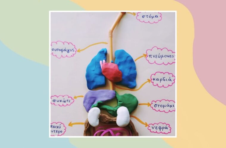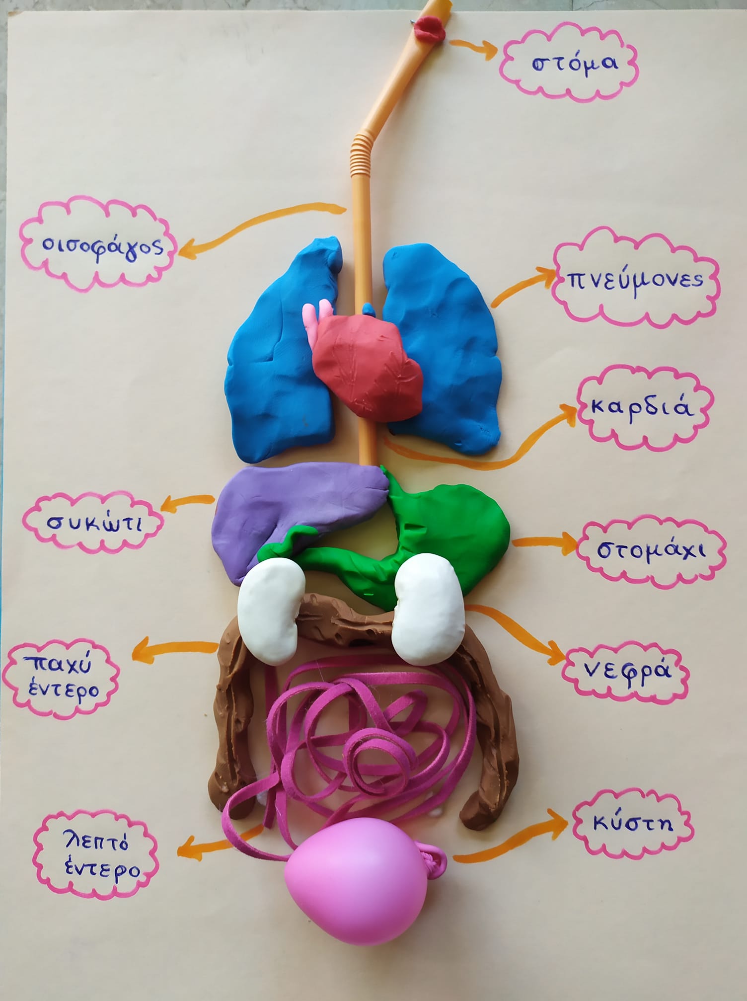 Χρησιμοποιώντας λοιπόν πλαστελίνες, μπαλόνια, κορδέλες, φασόλια, ένα καλαμάκι, στυλό και μαρκαδόρους, σχημάτισε με έναν τρομερά ακριβή τρόπο το πεπτικό μας σύστημα, ονομάζοντας κάθε σημείο της ανατομίας μας που χρειάζεται να γνωρίζουμε, από το στόμα μέχρι την κύστη. Εμείς δεν μπορούμε παρά να το θαυμάσουμε και να επισημάνουμε στους γονείς των μαθητών της πόσο τυχεροί είναι που την έχουν!