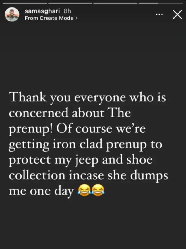 “Ευχαριστώ όλους όσους ανησυχούν για το προγαμιαίο συμβόλαιο! Φυσικά, θα κάνουμε ένα τεθωρακισμένο προγαμιαίο συμβόλαιο, για να προστατεύσω το jeep και τη συλλογή παπουτσιών μου, σε περίπτωση που με παρατήσει μια μέρα”.