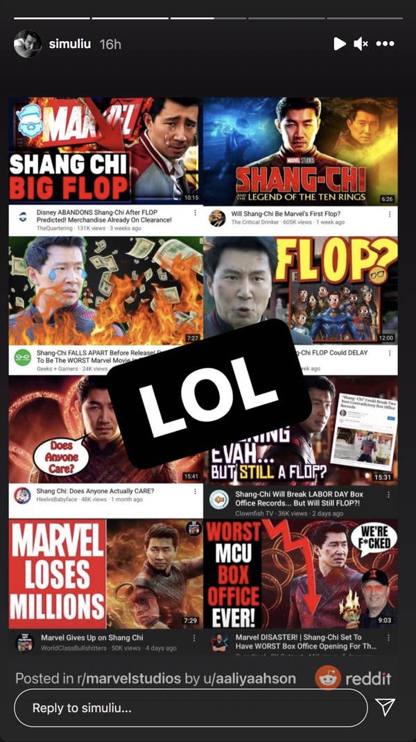 Το, ας πούμε, αστείο της υπόθεσης; Πριν την πρεμιέρα της ταινίας, μία μερίδα κόσμου και κυρίως YouTubers είχαν προεξοφλήσει ότι θα καταλήξει να είναι μία τεράστια αποτυχία. Ο πρωταγωνιστής, Simu Liu, τότε δεν έκανε κανένα σχόλιο. Μόλις, όμως, είδε την επιτυχία του Shang-Chi and the Legend of the Ten Rings, αποφάσισε ότι έφτασε η ώρα να μιλήσει. Κι εμείς τον λατρέψαμε.