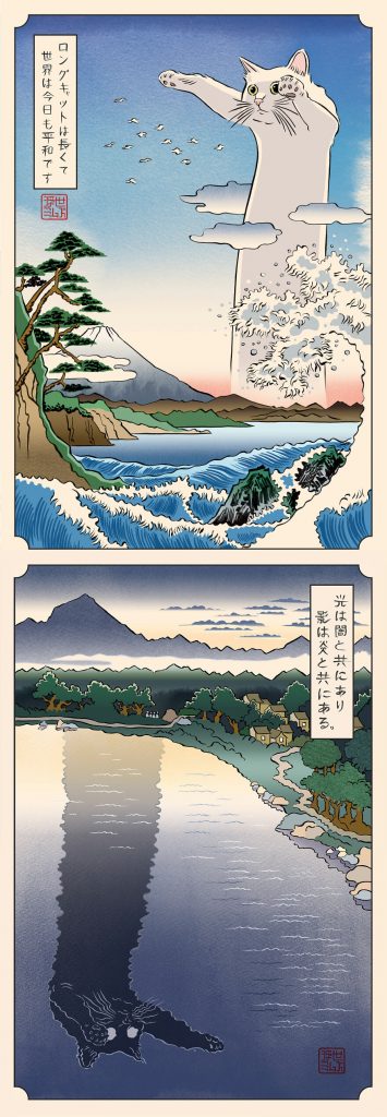 Ευτυχώς, κάποιος ανέλαβε να τους την κάνει. Ένας Ιάπωνας αποφάσισε να ανασκευάσει διάσημα memes μέσα από την τεχνική ukiyo-e. Ένωσε, δηλαδή, τη βασική τους εικόνα με ένα παραδοσιακό ιαπωνικό είδος τέχνης, που συνδυάζει ξυλογραφία και ζωγραφική. Αφορμή ήταν η γυναίκα του, που λατρεύει το meme με τη γυναίκα που φωνάζει σε μία γάτα. Ήθελε να της το κάνει δώρο για τα Χριστούγεννα σε μορφή ukiyo-e.