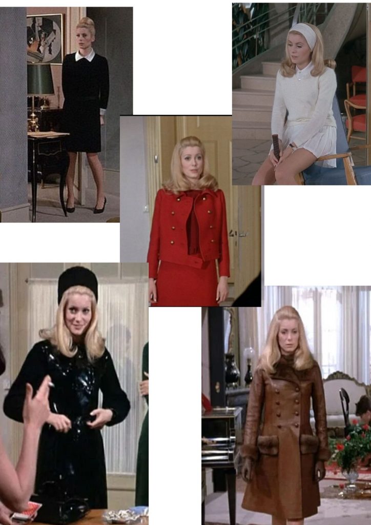Στο φανταστικό Belle du Jour/Η ωραία της ημέρας η Catherine Deneuve υποδύεται την Severine, την σύζυγο ενός πλούσιου άντρα η οποία για διάφορους λόγους επιλέγει να στραφεί στην πορνεία, ζώντας μια διπλή ζωή. Ο στόχος του Bunuel, του λαμπρού σκηνοθέτη, ήταν να παρουσιάσει τη σεξουαλικότητα της Severine απενοχοποιημένα, και ήταν ίσως ο πρώτος filmmaker στα χρονικά που επιχείρησε κάτι τέτοιο. Τον σχεδιασμό των κοστουμιών της ταινίας ανέλαβε ο νέος ακόμα τότε αλλά ήδη αναγνωρισμένος Yves Saint Laurent, και κατά τις υποδείξεις του σκηνοθέτη του, δημιούργησε την γκαρνταρόμπα της Severine με γνώμονα το προφίλ της ως μέλος της μπουρζουαζίας και όχι από το πρίσμα της πόρνης. Ο λόγος ήταν ότι ο Bunuel δεν ήθελε να μιλήσει για την σεξουαλικότητα μέσα από το πρίσμα του “γυμνού”, το προφανές δηλαδή, αλλά να εστιάσει στην ίδια την σεξουαλικότητα σαν κατάσταση και φύση. Έτσι, σε όλες τις σκηνές βλέπουμε την Deneuve ντυμένη “στην τρίχα” φορώντας σύνολα που αντικατόπτριζαν την υψηλή της θέση στην κοινωνία, αλλά και την ανεπτυγμένη της αίσθηση του στυλ. Επέλεγε κυρίως μονοχρωματικά λουκ πολύ υψηλής ποιότητας και τιμής, και ήταν πάντα ευπαρουσίαστη και όσο το δυνατόν πιο καλυμμένη. Αξίζει να σημειώσουμε ότι με αφορμή αυτήν την ταινία, δημιουργήθηκε μια πολύ στενή σχέση μεταξύ του σχεδιαστή-είδωλου και της iconic ηθοποιού που έμελλε να καθορίσει την καριέρα και των δυο.