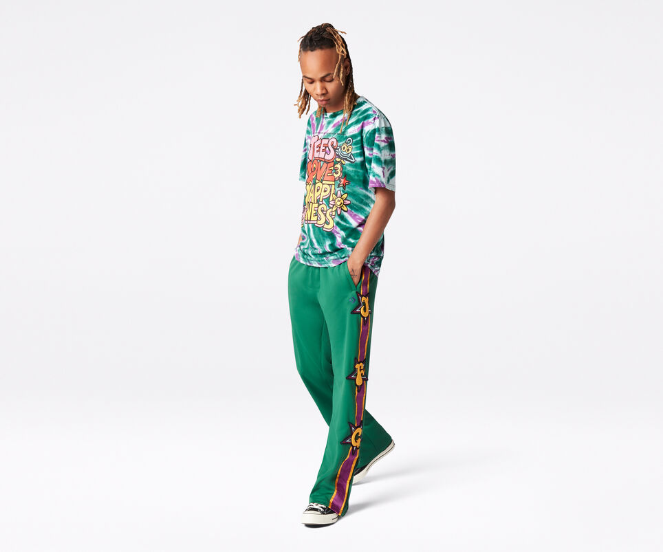 Στην επίσημη ανακοίνωση για τη συλλογή, μάς προειδοποιεί. Κάθε κομμάτι θα είναι σαν να διαβάζουμε μία νέα σελίδα ενός βιβλίου. Ενός βιβλίου για την αγάπη, τη μαύρη κουλτούρα, την ψυχή και την τέχνη. Και όταν κοιτάς τα κομμάτια, αυτό πράγματι επιβεβαιώνεται. Παντελόνια, t-shirts, φούτερ, τσάντες και sneakers αποτελούνται από στάμπες που θυμίζουν γκράφιτι ή γυαλίζουν, μωβ χρώματα ταυτισμένα με την ψυχική ενέργεια, tie-dye prints και ασημένιο γκλίτερ, που θυμίζει τα φώτα των clubs.