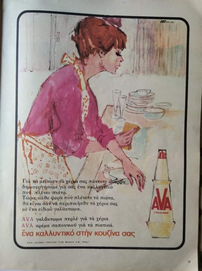 Τα περισσότερα προϊόντα που διαφημίζονται είναι φυσικά οικοκυρικού ενδιαφέροντος και δεν γίνεται παρά να αφορούν αποκλειστικά και μόνο τη γυναίκα, αφού εκείνη είναι η νοικοκυρά του σπιτιού. Είναι η εποχή των συσκευών. Η Ελλάδα μετά από έναν ακόμη Παγκόσμιο πόλεμο κι έναν Εμφύλιο, χρόνια απίστευτης φτώχειας, ανέχειας και οδύνης, βρίσκεται επιτέλους σε τροχιά ανάπτυξης και ευμάρειας. Όλα τα σπίτια οφείλουν να έχουν ένα σύγχρονο νοικοκυριό και μπορεί σύμφωνα με την διαφημιστική που ανέλαβε την καμπάνια της AEG το πλυντήριο πιάτων να εφευρέθηκε για να την ξεκουράσει, όμως το χαρωπό μοντέλο που ποζάρει χαρούμενο μπροστά από μία δυσθεώρητη στοίβα πιάτα, αναπαράγει το στερεότυπο που θέλει μονάχα τη γυναίκα νοικοκυρά, μονάχα εκείνη να πλένει τα πιάτα.