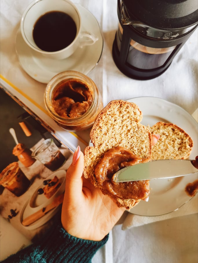 Ψωμί ολικής και spread αλατισμένης καραμέλας με χουρμάδες
