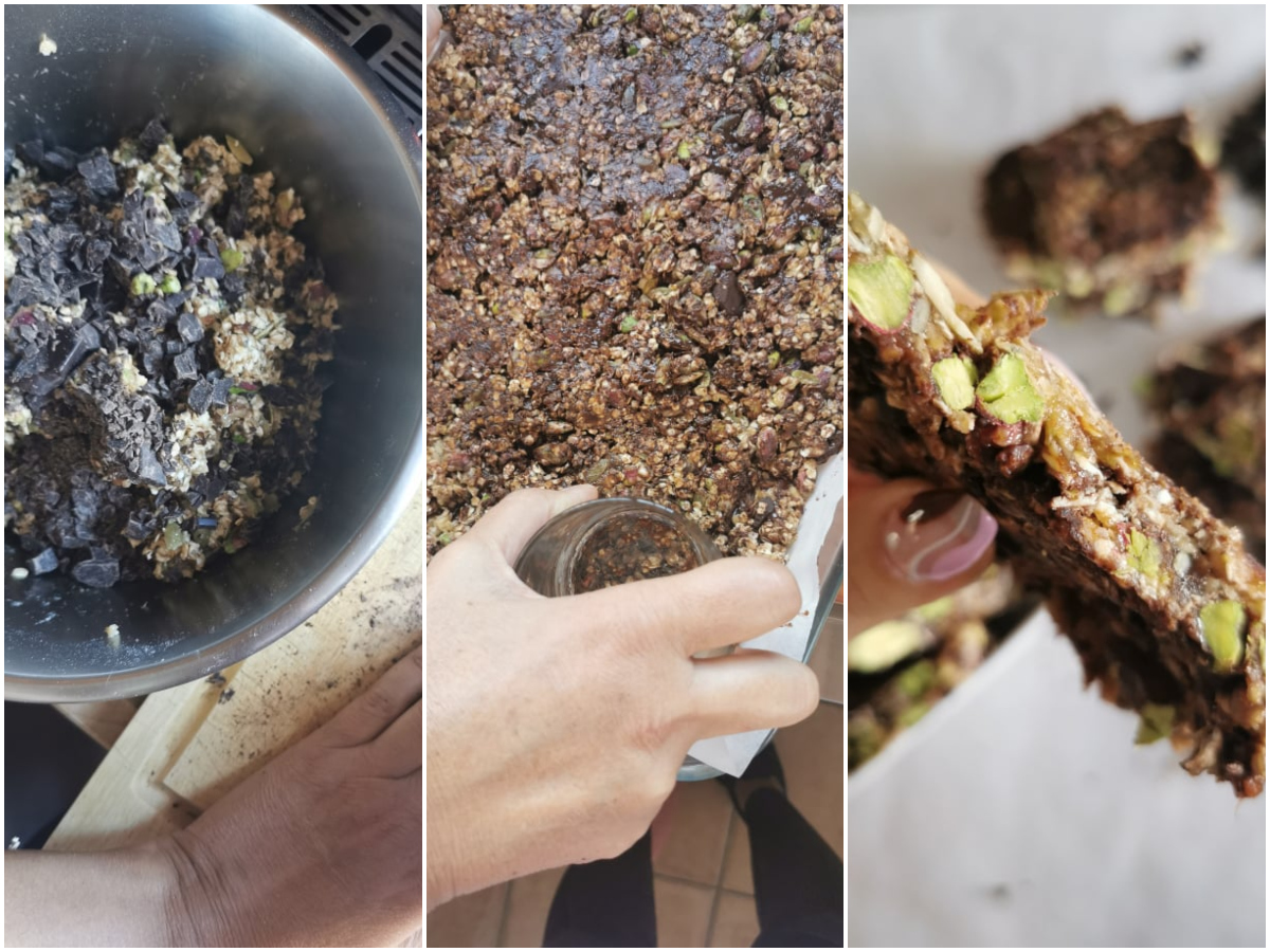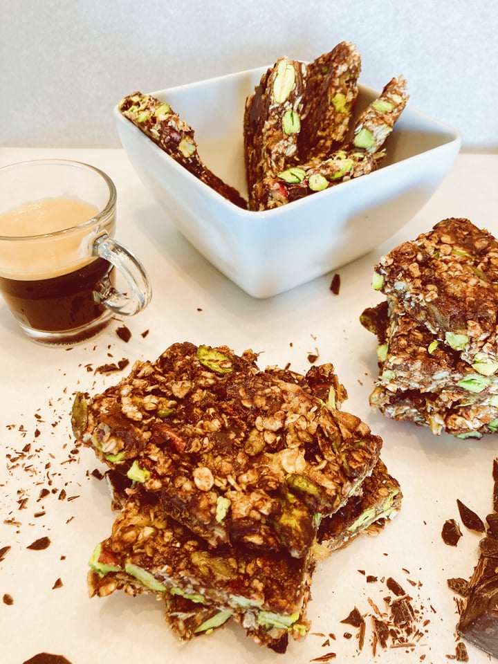 Έχοντας ήδη περάσει μία ολόκληρη ημέρα τρώγοντας φαγητά με διαφορετικές γεύσεις από τα συνηθισμένα (και χωρίς καμία αποτυχία ή αμήχανη στιγμή), αποφάσισα για πρωινό να καταπιαστώ με κάτι πολύ αγαπημένο: τις σπιτικές μπάρες δημητριακών. Αμέτρητοι οι συνδυασμοί που μπορείς να δοκιμάσεις, σχεδόν εγγυημένα νόστιμο αποτέλεσμα. Οι συγκεκριμένες ήταν εξαιρετικές, τόσο σοκολατένιες όσο έπρεπε για να θέλεις τρεις στην καθισιά σου, ενώ τα ολόκληρα φιστίκια Αιγίνης έκλεψαν την παράσταση. Ο μόνος λόγος που σταμάτησα να τις τρώω ήταν γιατί δεν θα είχα όρεξη για μεσημεριανό αν συνέχιζα. Και δεν γινόταν να μην φάω μεσημεριανό.