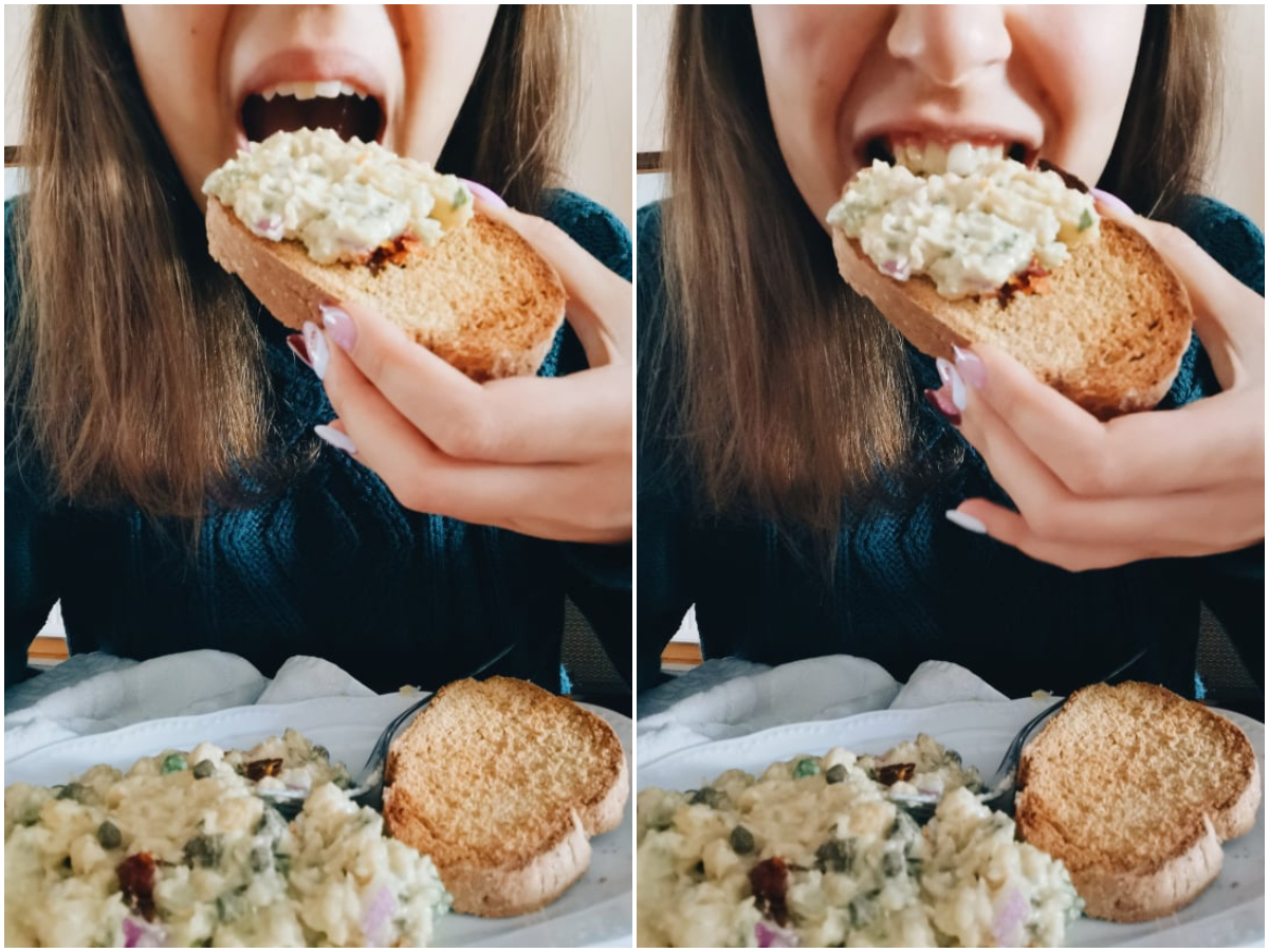 Γενικά το βράδυ τρώω κάτι ελαφρύ, εκτός και αν βλέπω Netflix μέχρι τα ξημερώματα, όποτε και καταβροχθίζω πέντε γαβάθες ποπ κορν χωρίς να το καταλάβω. Αυτήν την φορά επέλεξα την ρεβιθοσαλάτα που υπόσχεται πως είναι το τέλειο υποκατάστατο της γνωστής και αγαπημένης tuna salad, μαζί με το ψωμί που είχε απομείνει από το πρωί (το οποίο ακόμα δεν μπορώ να ξεπεράσω πόσο ωραίο βγήκε). Έχω να δηλώσω πως εμένα προσωπικά η γεύση δεν μου θύμιζε τόσο την γνωστή τονοσαλάτα, επομένως σίγουρα δεν θα την χαρακτήριζα υποκατάστατο.Όμως αυτό δεν σημαίνει πως δεν ήταν νόστιμη. Αντιθέτως, ξετρελάθηκα με την γεύση της σε βαθμό που δεν μπορούσα να σταματήσω να την τρώω. Αρωματική, αλμυρή όσο πρέπει, καθόλου βαριά, τέλεια συνοδεία σε μία φέτα ψημένου ψωμιού. Να τολμήσω να πω πως μου άρεσε περισσότερο από το original; Θα το τολμήσω.
