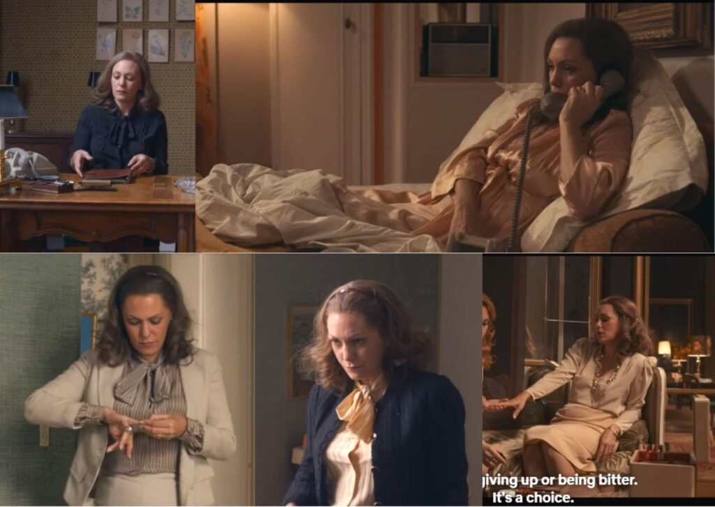 Όσον αφορά τώρα τις δυο πρωταγωνίστριες, η Madame Claude ντύνεται με κομμάτια συντηρητικά μεν αλλά που αποπνέουν δυναμισμό, καθώς βρίσκεται σε θέση ισχύος. Την βλέπουμε να φοράει ταγέρ σε μπεζ και μπλε ρουαγιάλ, μεταξωτά πουκάμισα με pussy bow, και κοσμήματα που επιδυκνύουν τον πλούτο της. Η δεύτερη πρωταγωνίστρια από την άλλη, η Sidonie, είναι ένα νέο κορίτσι από πολύ πλούσια οικογένεια η οποία επιλέγει συνειδητά να εργαστεί σε αυτό το χώρο. Μέσα από την γκαρνταρόμπα της λοιπόν αντικατοπτρίζεται ο χαρακτήρας της, είναι επαναστάτρια, απελευθερωμένη σεξουαλικά, απόμακρη, σκοτεινή και παλεύει να ανακτήσει τον έλεγχο της ζωής της. Επιλέγει λοιπόν ρούχα σε σκούρα χρώματα, κυρίως μαύρα, φοράει πολλή διαφάνεια, και τα βασικά κομμάτια με τα οποία την βλέπουμε είναι πουκάμισα, σακάκια, κοντά φορέματα, και πολυτελή χρυσά κοσμήματα. Και καθώς εντυπωσιαστήκαμε τόσο πολύ από τα εν λόγω κοστούμια, σκεφτήκαμε να εμπνεύσουμε και εσάς με αυτά. Παρακάτω λοιπόν θα βρείτε την πεμπτουσία του στυλ και των δυο ηρωίδων αλλά και πως να τα προσαρμόσετε στην δική σας γκαρνταρόμπα!