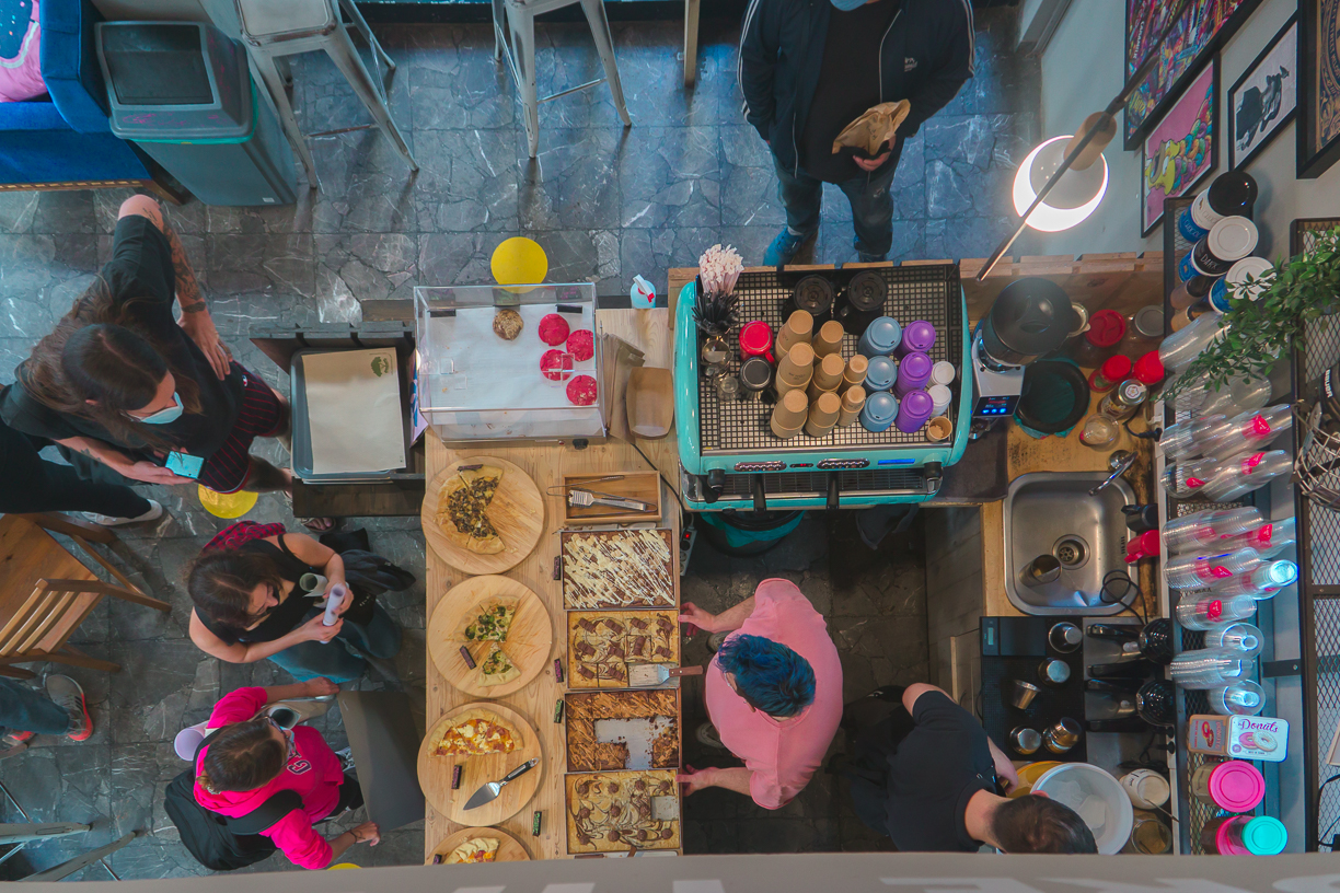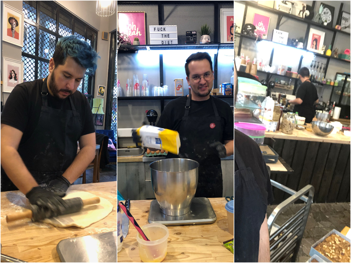 Το αργότερο που μπορούν να βρεθούν στο μαγαζί είναι εφτάμιση το πρωί και αμέσως μπαίνουν σε έναν αγώνα ταχύτητας με το ρολόι, καθώς πρέπει να έχουν ετοιμάσει όλα τα φαγώσιμα πριν τις έντεκα, ώρα ανοίγματος. Μπισκότα, τάρτες, cinnamon rolls, τούρτες γενεθλίων, gallettes, brownies και ό,τι άλλο έχει πλάσει ο νους τους ξεκινούν να ζυμώνονται στην μικρή κουζίνα του κάτω ορόφου αλλά κυρίως στον ίδιο τον πάγκο που εσύ σε λίγες ώρες θα δεις πεντακάθαρο και γεμάτο καλούδια.