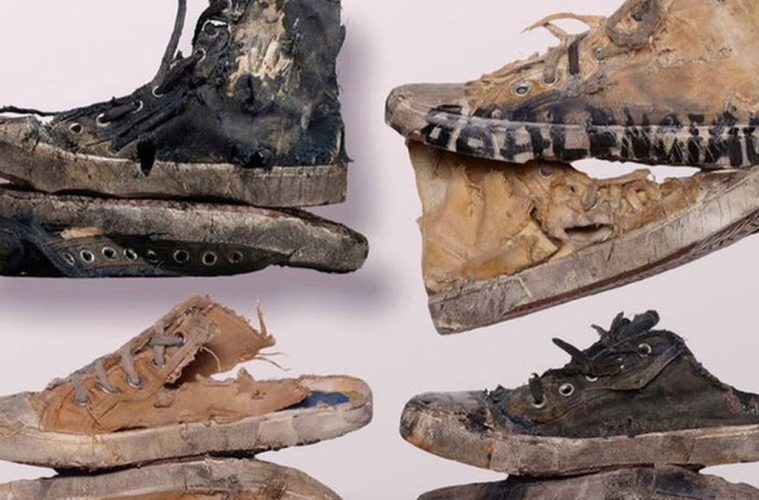 Φθαρμένα “μέχρι το κόκκαλο” sneakers που οριακά δεν φοριούνται από την ταλαιπωρία είναι οι πρωταγωνιστές της πιο πρόσφατης καμπάνιας του οίκου. Και δεν μιλάμε για φθορά που θα δεις σε ένα παπούτσι από “δεύτερο χέρι” αλλά για φθορά που θα έβλεπες σε κομμάτια που έχουν πεταχτεί στα σκουπίδια. Η ιστορία πίσω από την καμπάνια; Βιωσιμότητα. Η ειρωνεία πίσω από την καμπάνια; Τα εν λόγω 100 συλλεκτικά κομμάτια, που κοστίζουν 1.500 ευρώ το ένα (!), φτιάχτηκαν από ολοκαίνουργια sneakers τα οποία καταστράφηκαν επί τούτου για την συγκεκριμένη καμπάνια, κάνοντας την λέξη βιωσιμότητα να ακούγεται τουλάχιστον προκλητική.