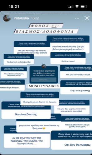 Από εκεί και πέρα, οι διαφορές στις απαντήσεις ήταν χαοτικές. Από τη μία, έχουμε τις γυναίκες με τους βασικούς φόβους τους να είναι ουσιαστικά η πιθανότητα κάποιο έγκλημα να διαπραχτεί εναντίον τους. Κάποιες μόνο από τις χαρακτηριστικές απαντήσεις, που πήρε, ήταν “Ειλικρινά, ότι θα με βρουν οι δικοί μου σε χαντάκι”, “Μην με βιάσει ή μου ρίξει κάτι στο ποτό μο και μετά με ξεμοναχιάσει”, “Αν θα έχω την τύχη της Καρολάιν, της Ελένης, της Γαρυφαλλιάς…”, “Να νιώσω την οποιαδήποτε πίεση στο να κάνω κάτι που δεν θέλω να κάνω” και “Να είναι τρελός και να μού κάνει οτιδήποτε είτε να με ακολουθήσει μετά και να με απειλεί”. Με άλλα λόγια, βιασμός, δολοφονία, παρενόχληση, απαγωγή και σεξουαλική πίεση είναι κάποιοι μόνο από τους κύριους φόβους των γυναικών στα πρώτα ραντεβού.