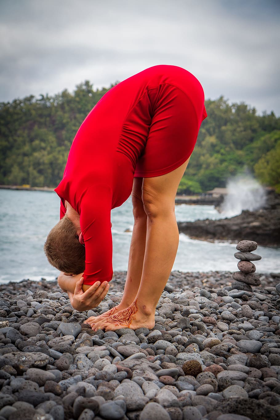 Πατώντας γερά τα πόδια στο έδαφος σκύβουμε μπροστά αφήνοντας το σώμα να πέσει αργά έτσι ώστε τα χέρια μας να ακουμπήσουν στο δάπεδο. Αν δεν φτάνουν ως εκεί δεν πειράζει, δεν πιέζουμε το σώμα μας απλά αφήνουμε το βάρος του κορμού μας να πέσει μπροστά. Μένουμε εκεί για 5 αναπνοές. Ίσως να νοιώσουμε ένα ελαφρύ τράβηγμα στους πίσω μυς των ποδιών μας, που είναι καλό. Για μεγαλύτερη ανακούφιση μπορούμε να αγκαλιάσουμε τους αγκώνες μας με τις παλάμες και να λικνιστούμε λίγο μπρος πίσω σαν να τινάζουμε μια πετσέτα.